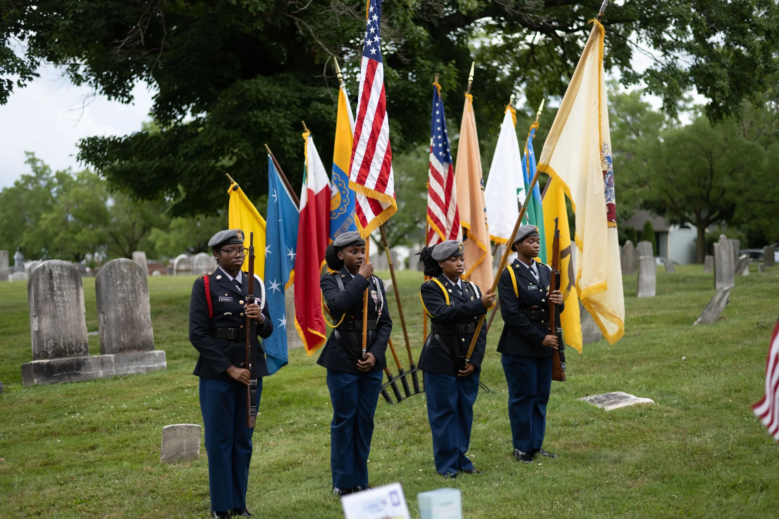 He fulfilled his vision of becoming a successful farmer and raising a family. In 1789 he married an enslaved woman named Mary, purchased her, and set her free. Together they raised nine children. Jacob and Mary became well-respected members of the Flemington Baptist Church and resided for several decades in Flemington. Their youngest son, Abner Hunt Francis, became very well educated and spent his adult life working for the cause of abolition and equal rights for all people. He had been inspired by his father, whom he always said, the “principles of ’76, which led … his country to throw off the British yoke, actuated my father to shoulder his musket and serve through a bloody contest. And not only my father’s but the blood of colored men were freely shed in that struggle for national independence.” The fight for independence during the American Revolution was successful during his lifetime, but the revolution to guarantee equal rights for all people still went on. On June, 26, 2023 the New Jersey Society of the Daughters of the American, the Sons of the Revolution in the State of New Jersey, and the New Jersey Society of the Sons of the American Revolution dedicated a historical interpretive marker near the gravesite of Mary and Jacob Francis at the Flemington New Jersey Baptist Church in front of a crowd of almost ninety guests and dignitaries. The Combined Color Guards of the SR-NJ and the SAR were joined by the Irvington New Jersey High School “Crusaders” Junior ROTC Color Guard.